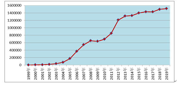 2019年全國藥品不良反應(yīng)監(jiān)測網(wǎng)絡(luò)收到《藥品不良反應(yīng)/事件報告表》151.4萬份。1999年至2019年,全國藥品不良反應(yīng)監(jiān)測網(wǎng)絡(luò)累計收到《藥品不良反應(yīng)/事件報告表》1,519萬份(圖1)。