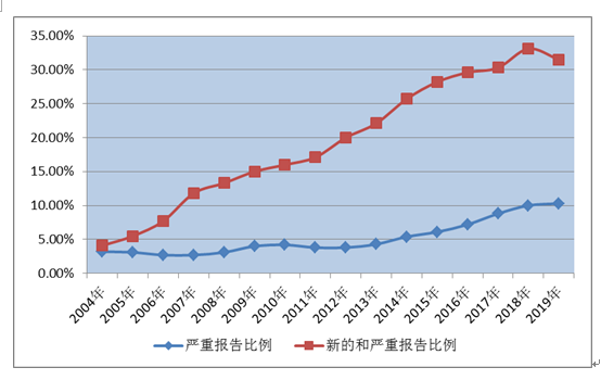圖2 2004年-2019年新的和嚴重以及嚴重藥品不良反應(yīng)/事件報告比例