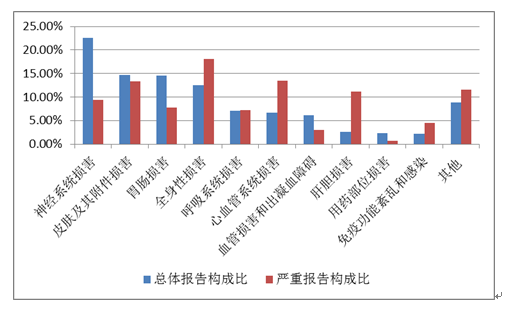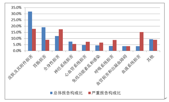 2019年國家基本藥物化學藥品和生物制品不良反應(yīng)/事件報告,按照藥品類別統(tǒng)計,報告數(shù)量排名前5位的分別是抗微生物藥、心血管系統(tǒng)用藥、抗腫瘤藥、激素及影響內(nèi)分泌藥、治療精神障礙藥;累及器官系統(tǒng)排名前5位的是皮膚及其附件損害、胃腸損害、全身性損害、神經(jīng)系統(tǒng)損害以及血液系統(tǒng)損害。
