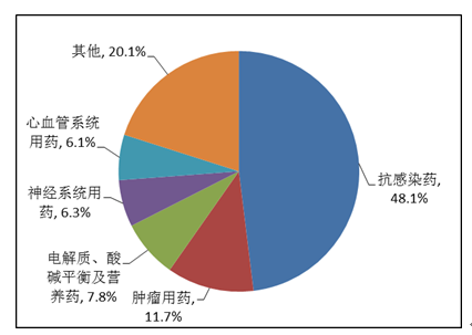 按照藥品類別統(tǒng)計,化學藥品占86.6%,中藥占12.6%,生物制品占0.8%?;瘜W藥品排名居前的藥品類別是抗感染藥、心血管系統(tǒng)用藥、腫瘤用藥、神經(jīng)系統(tǒng)用藥、電解質(zhì)、酸堿平衡及營養(yǎng)藥;中藥排名居前的藥品類別是理血劑、補益劑、祛濕劑、開竅劑、清熱劑。